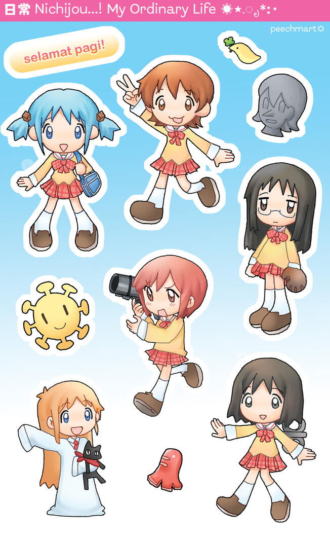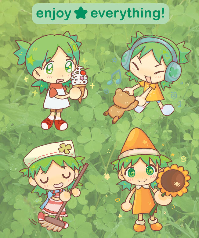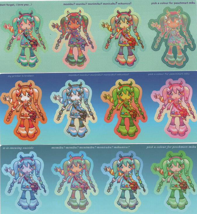 layering clothes, ants, miku, figurines, mixed media, birthdays, buttons, cake, yotsuba!, fruits, karaoke and playing games!